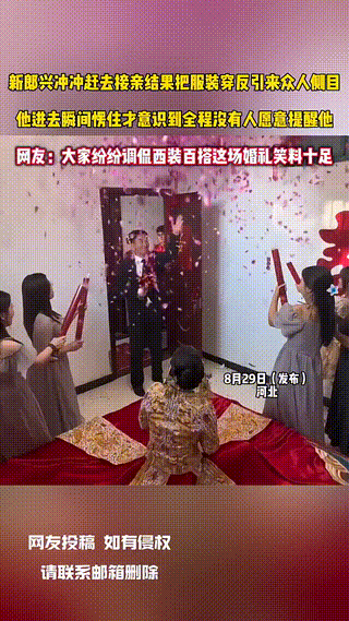 視訊中的新郎在接親時因為匆忙,竟然把服裝穿反了,結果引來眾人的側目。而更令人意想不到的是,整個過程居然沒有人愿意提醒他。直到新娘見到他,才驚訝地詢問「你的秀禾呢?」這時新郎才意識到自己的失誤,瞬間愣住了。不禁讓人想,究竟是誰疏忽了這個重要的細節呢?