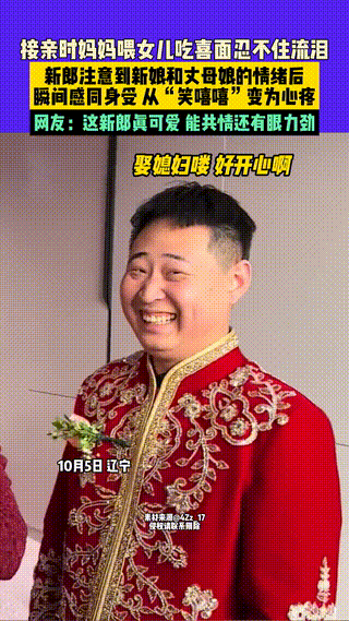 視訊里,新娘穿著精美的中式婚服,這一刻她的媽媽端起一碗熱氣騰騰的喜面親手喂給女兒。誰知,這份看似平常的小儀式竟承載了許多情感,媽媽眼眶泛紅,聲音哽咽,顯然是不舍還夾雜著祝福。而一旁的新郎,原本臉上笑容洋溢,卻突然注意到丈母娘的眼神和情緒,瞬間從歡快變得莊重起來。接下來,他的一系列自然舉動,不僅展現了高情商,更讓人看到了不一樣的溫柔。至于這位新郎到底做了什麼,畫面又如何引得網友熱議?建議自己看一看。